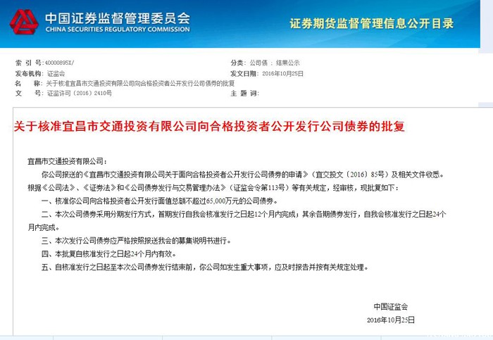 2016年10月25日,筆者從中國證券監(jiān)督管理委員會(huì)獲悉,根據(jù)中國證監(jiān)會(huì)證監(jiān)許可【2016】2410號(hào)《關(guān)于核準(zhǔn)宜昌市交通投資有限公司向合格投資者公開發(fā)行公司債券的批復(fù)》文件,交投公...